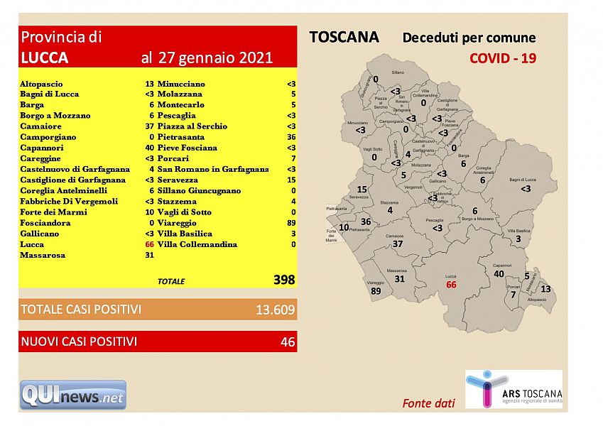 A livello provinciale il contagio ha colpito 46 persone in più nelle ultime ventiquattro ore, mentre le 3 nuove vittime odierne - l'altra è registrata in Versilia, relativa a una donna di 85 anni - portano la triste contabilità dei deceduti totali da inizio pandemia in provincia a 398 morti. Il bollettino della Regione conta un totale, oggi, di 13.609 persone positive a coronavirus in provincia di Lucca.