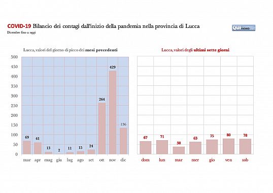 A livello provinciale il contagio ha colpito 78 persone in più nelle ultime ventiquattro ore. Il bollettino della Regione conta un totale, oggi, di 12.307 persone positive a coronavirus in provincia di Lucca.