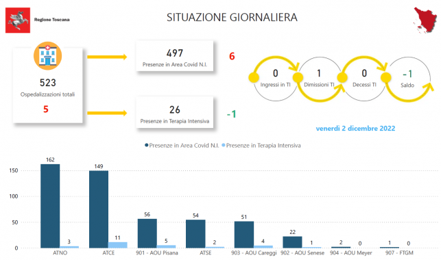 Gli attualmente positivi sono oggi 68.482, +1,9% rispetto a ieri. I ricoverati oggi sono 523 (5 in più rispetto a ieri), di cui 26 in terapia intensiva (1 in meno). Nel grafico sottostante e in quelli a corredo la situazione negli ospedali toscani.