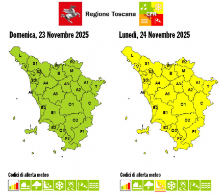 TOSCANA — Piogge e temporali in arrivo sulla Toscana che, già da questa sera, sarà interessata da una nuova perturbazione. La sala operativa della protezione civile ha emesso un codice giallo per rischio idrogeologico e idraulico del reticolo minore su tutta la regione nella giornata di domani, lunedì 24 Novembre.