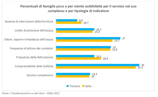 Al capitolo bollette c'è anche da registrare certo sgradimento da parte dell'utenza non solo per le tariffe: il 35% delle famiglie toscane si dichiara poco o per niente soddisfatto della loro comprensibilità.